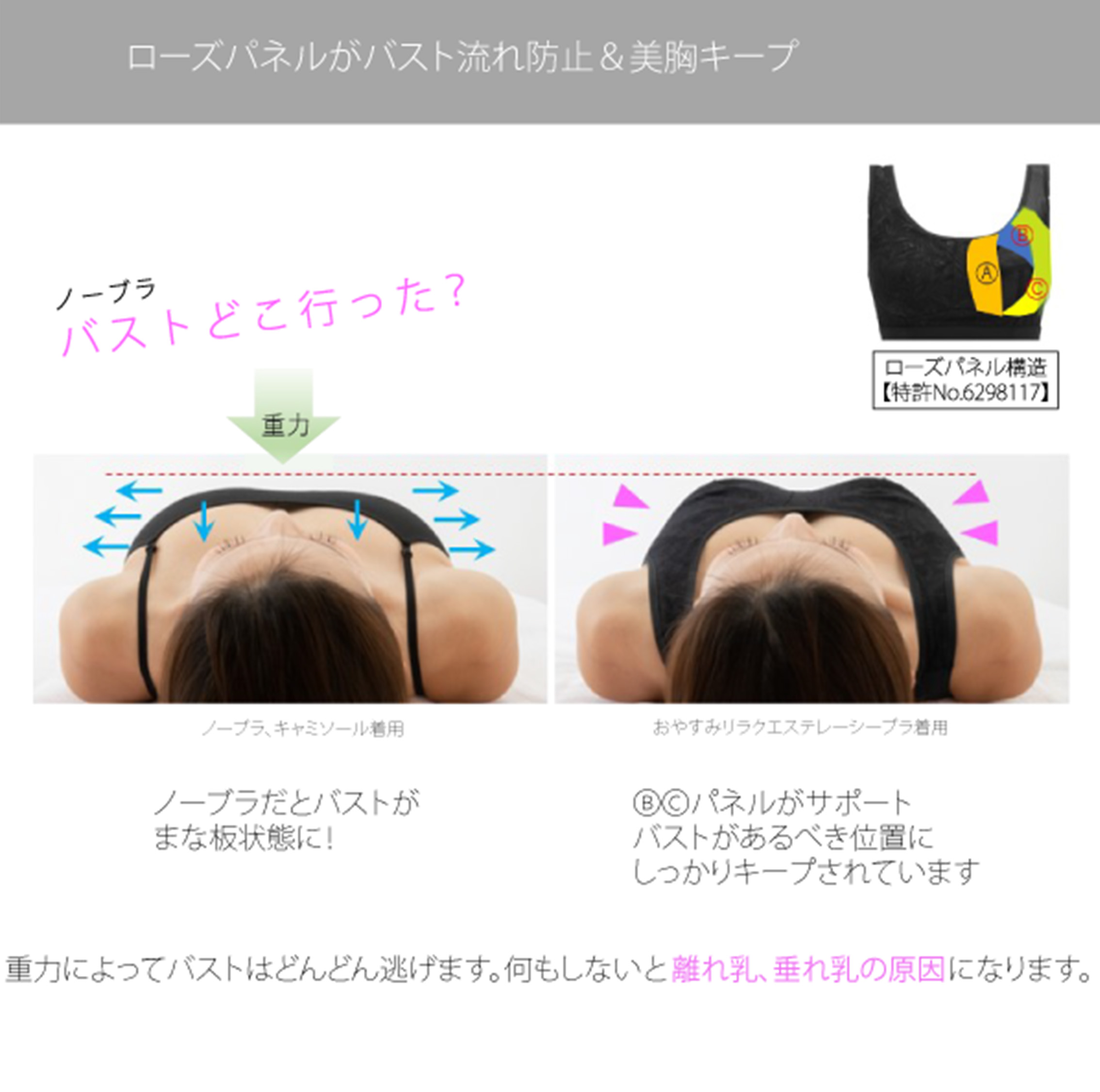 ナイトブラで就寝時バストケアを習慣に 美と健康のために良質な休息を。ナイトブラで就寝時バストケアを習慣に。 ローズパネル構造が、寝ている間のバストをやさしくホールド&キープ。 上品なレースデザインで、リラックスタイムやお出かけ時にもおすすめ。 ※特許No.6298117 素材:ナイロン、ポリウレタン カラー:ブラック